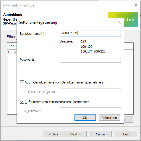 Beispiel Screenshot UCServer - SIP Trunk hinzufügen - Softphone Registrierung - Leitungen für Leitungsgruppe