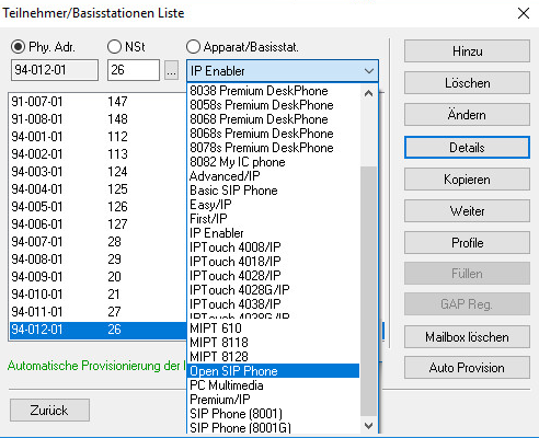 Der Nebenstelle/dem Teilnehmer muss als Apparat/Basisstat. Open SIP Phone zugewiesen werden.
