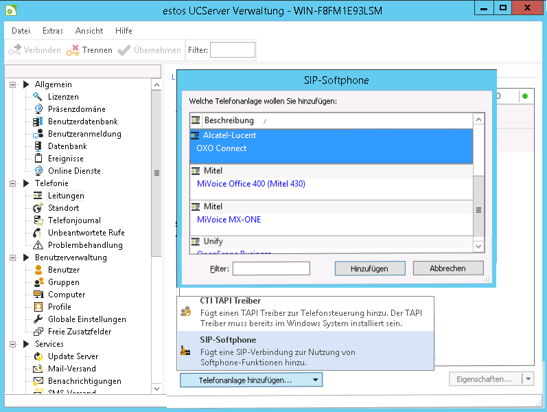 Beispiel Screenshot: UCServer Verwaltung - Telefonie - Leistungen - SIP-Softphone