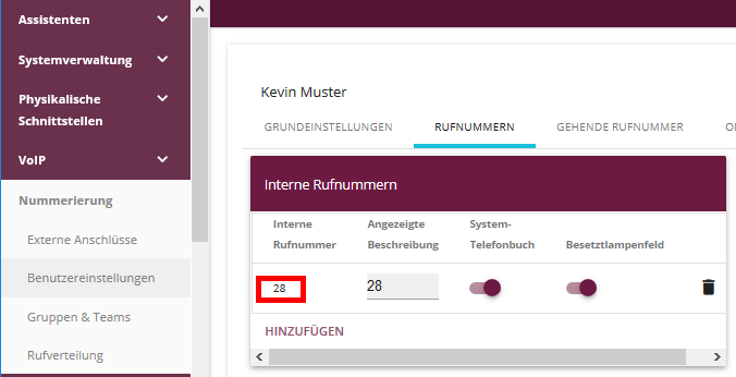 Beispiel Screenshot: be.IP plus Konfiguration - VoIP - Nummerierung - Benutzereinstellungen - Rufnummern