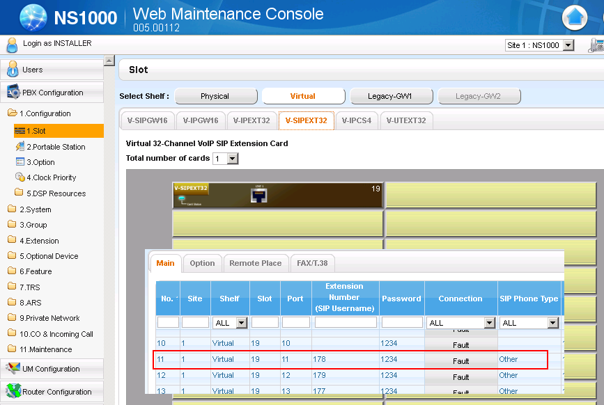 Beispiel Screenshot: Panasonic KX-NS-1000 Web Maintenance Console - PBX Configuration - Slot - Virtual - V-SIPEXT32 - Main