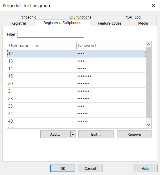 Beispiel Screenshot: Eigenschaften für Leitungsgruppe - Softphone Registrierungen - Benutzername und Kennwort