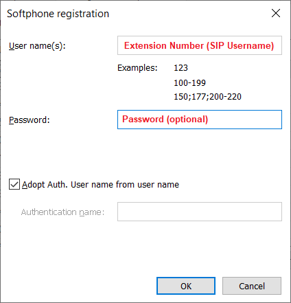 Beispiel Screenshot: Softphone Registrierung - Extension Number (SIP Username)/Benutzername und Passwort
