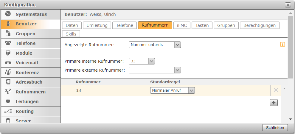 Beispiel Screenshot STARFACE Konfiguration - Benutzer - Rufnummern