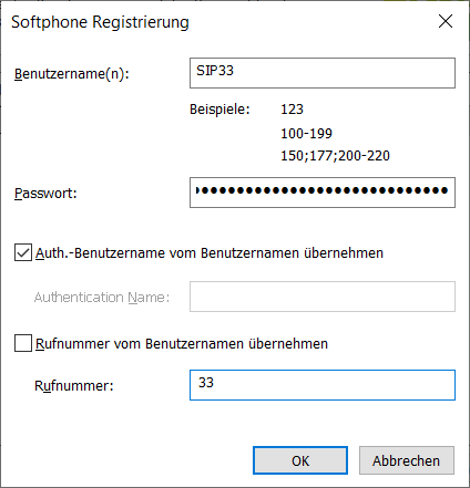 4. Wert: Rufnummer vom Benutzernamen abweichend (optional).