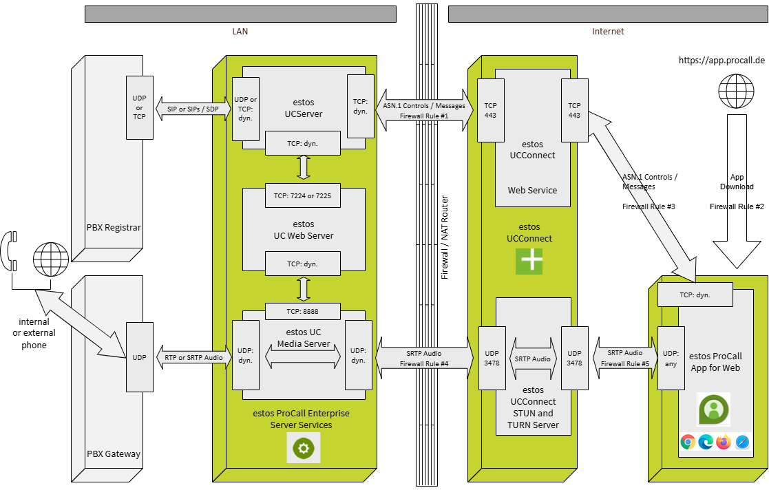 Das folgende Topologiediagramm zeigt eine typische ProCall Enterprise Installation einschließlich estos UCConnect Anbindung bei einer angenommenen uneingeschränkten Kommunikation zwischen estos ProCall App for Web und estos UC Media Server via UDP.