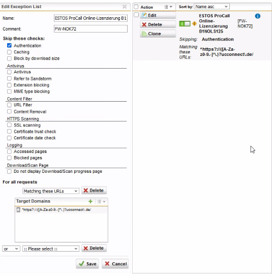 Beispiel Screenshot: Edit Exception List - ProCall Online-Lizenzierung - Skip Authentication - Target Domains Matching the URL *ucconnect.de