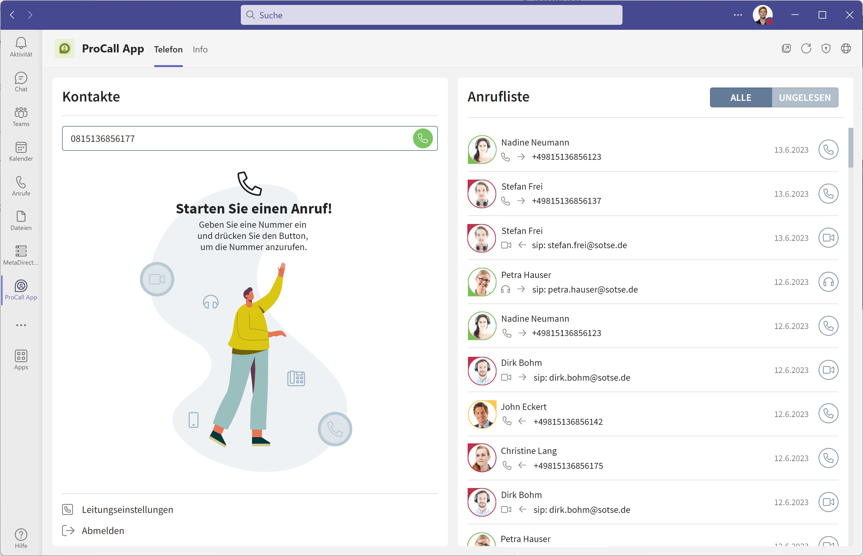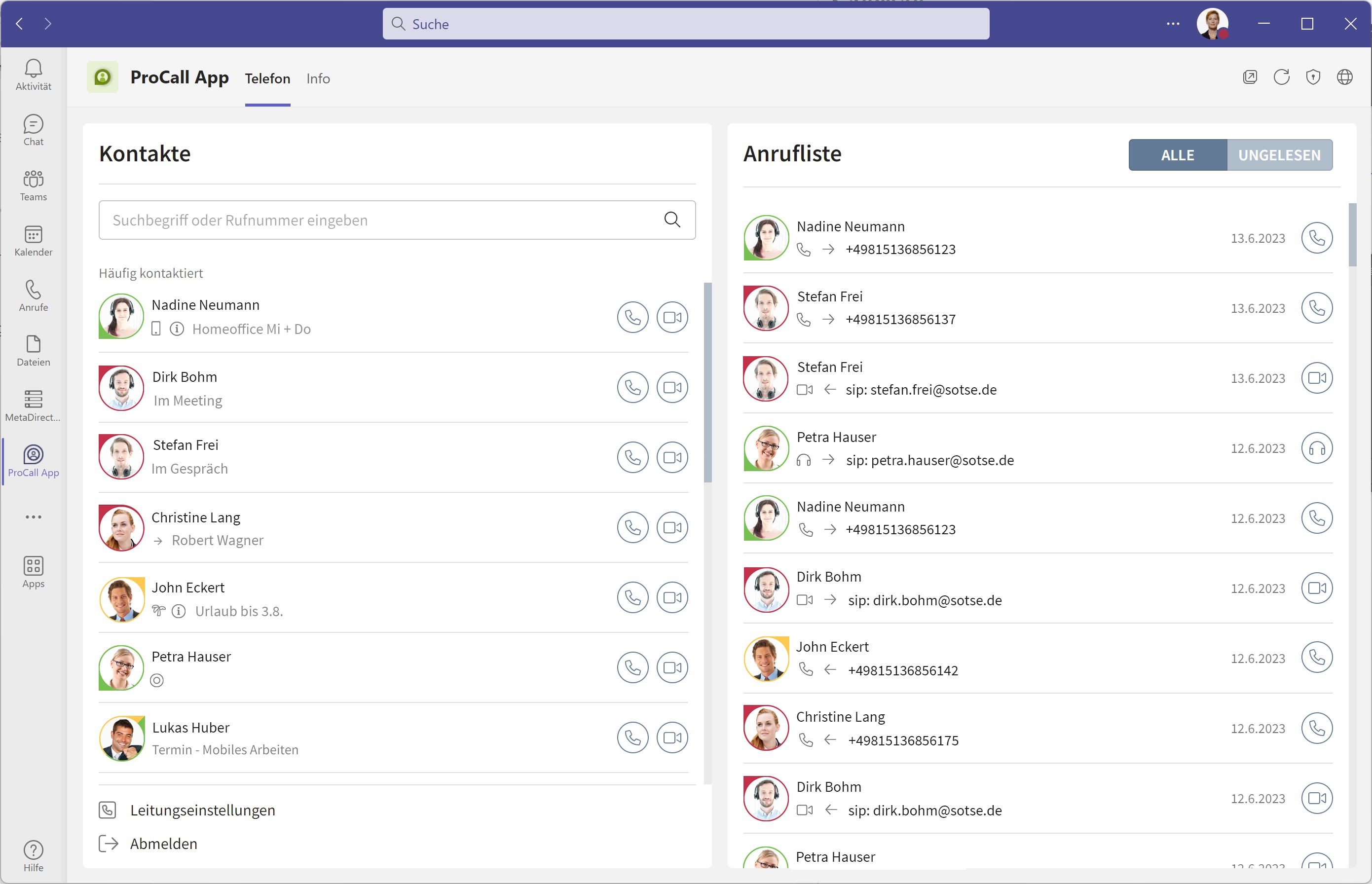 - Anrufliste: Überblick über ProCall Anrufe sowie Audio-/Video-Chats direkt in Microsoft Teams (letzte hundert Jornaleinträge)