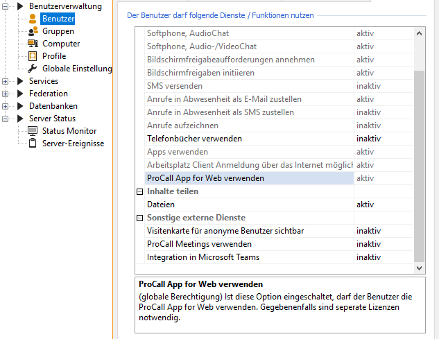 Die Benutzung der ProCall App für Web erfordert keine separate Genehmigung mehr in der UCServer Verwaltung. Achten Sie auf ausreichend Mobility Services Lizenzen für die Nutzung der ProCall App für Web außerhalb des Firmennetzwerks.