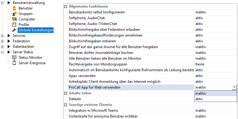 Beispiel Screenshot UCServer Verwaltung - Benutzerverwaltung - Globale Einstellungen - ProCall App für Web für alle Benutzer aktivieren/deaktivieren