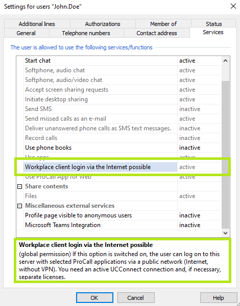 Beispiel Screenshot estos UCServer Verwaltung - Benutzerverwaltung - Benutzer - Einstellungen für Benutzer - Dienste - Allgemeine Funktionen - Arbeitsplatz Client Anmeldung über das Internet möglich