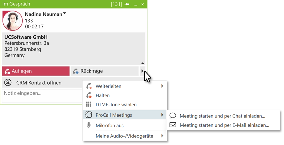 Beispiel Screenshot: ProCall Client für Windows - Gesprächsfenster - Im Gespräch - ProCall Meetings - Meeting starten und einladen