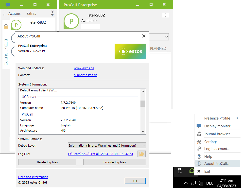 Erforderlichenfalls können diese Daten bereitgestellt werden, siehe hierzu Daten für eine Analyse bereitstellen. Dazu können Sie auch das Loglevel festlegen. Folgen Sie dafür ggf. den Anweisungen Ihres Administrators oder Ihrer estos Supportinstanz.