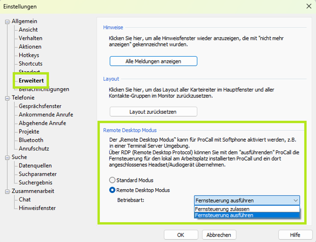 Den Remote Desktop Modus aktivieren/deaktivieren Sie in den ProCall Client Einstellungen unter Allgemein - Erweitert.