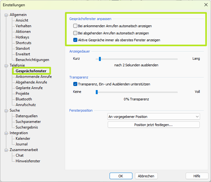Beispiel Screenshot: ProCall Client für Windows - Einstellungen - Telefonie - Gesprächsfenster - Gesprächsfenster anpassen