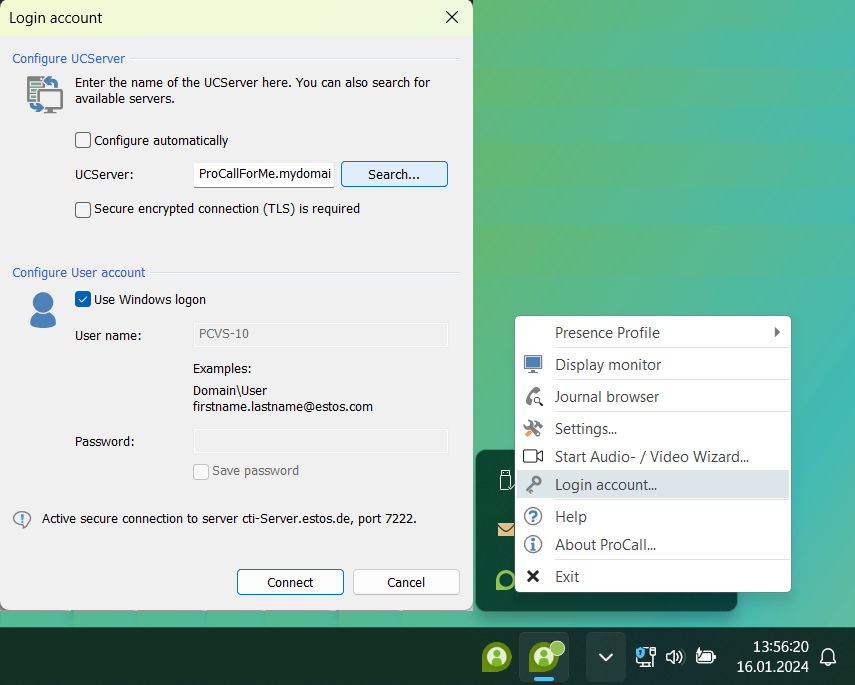 • Bei laufendem ProCall Enterprise Client via ProCall Enterprise Menüpunkt Anmeldekonto... im Tray Icon.