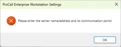 ProCall Enterprise Arbeitsplatzeinstellungen - Fehlermeldung zu fehlender Serveradresse und Port
