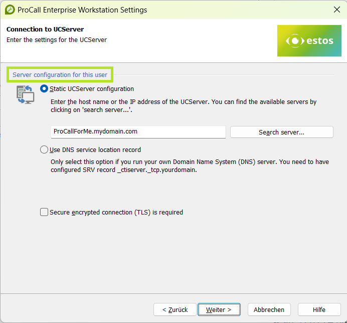 Beispiel Screenshot: ProCall Enterprise Arbeitsplatz-Einstellungen - Verbindung zum UCServer - Server-Konfiguration für diesen Benutzer
