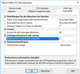 Beispiel Screenshot Eigenschaften für Leitungsgruppe - Rufnummern automatisch zuweisen - deaktivieren