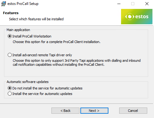 Falls das Installationspaket des ProCall Enterprise Clients parametrisiert ausgeführt werden soll, können Sie die entsprechenden Optionen hinsichtlich der Wahl des estos Remote TAPI-Treibers auch via Parameter an den Installationsvorgang übergeben.