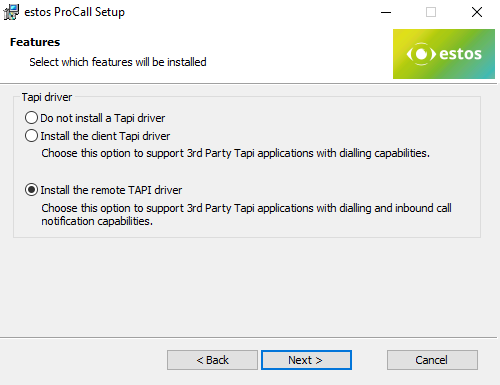 Beispiel Screenshot ProCall Setup - Features - Nur Remote TAPI-Treiber installieren