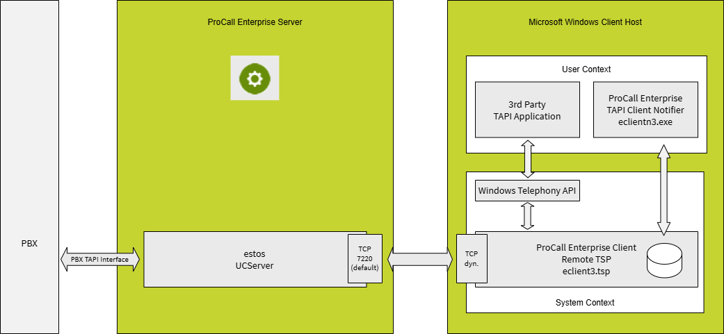 Um die Daten des Benutzers für die Kommunikation mit dem ProCall Enterprise Server nutzen zu können, wird im Benutzerkontext die Anwendung ProCall Enterprise TAPI Client Notifier eclientn3.exe betrieben, um die Benutzerdaten im Shared Memory des Remote TAPI-Treibers abzulegen.