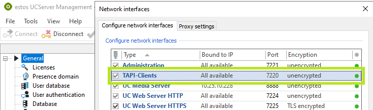 In der Standardkonfiguration kommuniziert der ProCall Enterprise Remote TAPI-Treiber mit dem ProCall Enterprise Server Port 7220 unverschlüsselt. Die Einstellungen zu diesem Server Interface können bedarfsweise geändert werden: