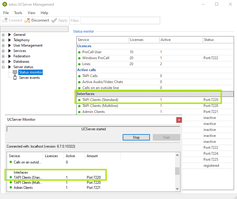 Der Status Monitor in der UCServer Verwaltung bzw. im UCServer Monitor zeigen im Service TAPI Clients (Standard) den verwendeten Port und die Anzahl aktuell verbundener Remote TAPI-Treiber: