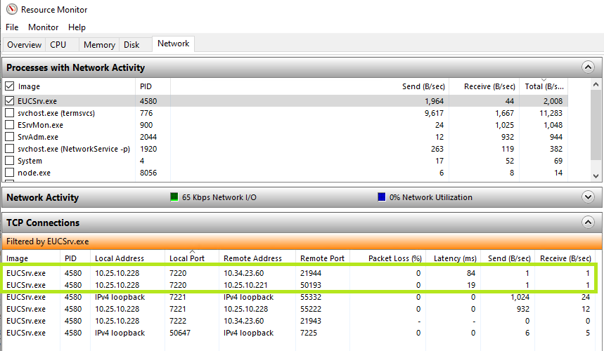 Auch der Microsoft Ressourcenmonitor kann bedarfsweise herangezogen werden, um die Verbindungen zum ProCall Enterprise Server TAPI Client Interface anzeigen zu lassen: