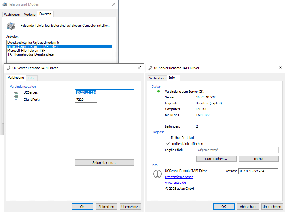 Mit Hilfe dieses Treibers wird es Software von Drittherstellern ermöglicht, alle Funktionen über TAPI und den estos UCServer zu verwenden. Dieser Treiber benötigt jedoch eine weitere TCP/IP-Verbindung zum Server.