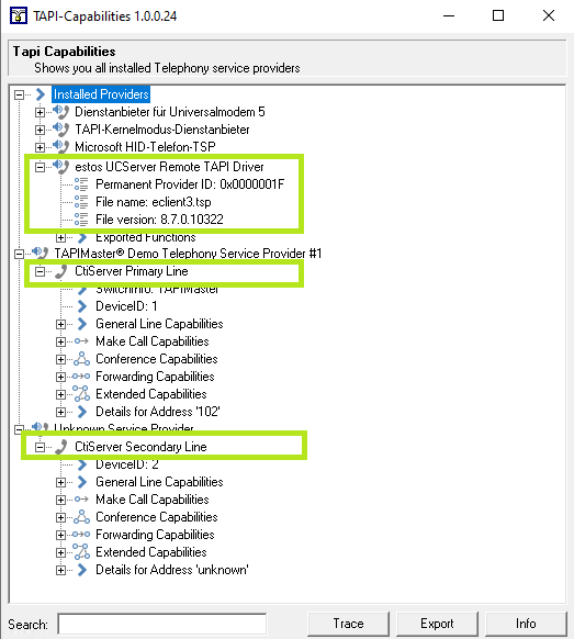 TapiCaps.exe zeigt als installiertem TAPI Service Provider den estos UCServer Remote TAPI Driver. Tatsächlich zeigen sich jedoch hier in der Liste der verfügbaren TAPI-Leitungen die direkt vom angebundenen ProCall Enterprise Server gespiegelten TAPIMaster Demo TSP-Leitungen, als ob ein TAPIMaster TAPI Treiber direkt auf diesem Client Host in Betrieb sei: