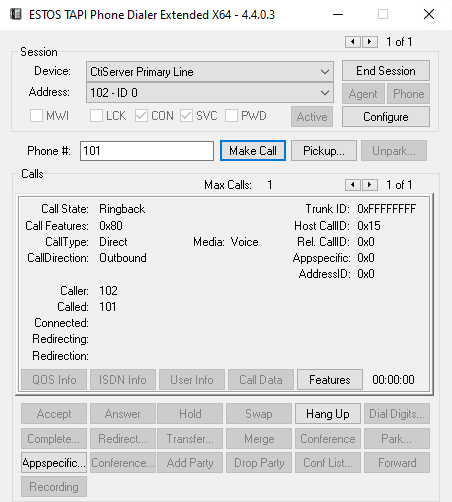 Mit der EPhoneX64.exe kann direkt geprüft werden, inwiefern das Microsoft Windows TAPI Subsystem die vom Remote TAPI-Treiber bereitgestellten beiden Leitungen einer TAPI-Anwendung tatsächlich anbietet, ob die Leitungen geöffnet (Start Session) werden können und ob auch eingehende Events gemeldet bzw. ausgehende Requests abgesetzt werden können: