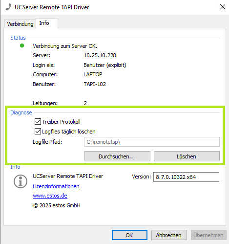 - und der Treiber-Protokolle des Remote TAPI-Treibers, die sich in der Standardkonfiguration im Verzeichnis C:\remotetsp befinden: