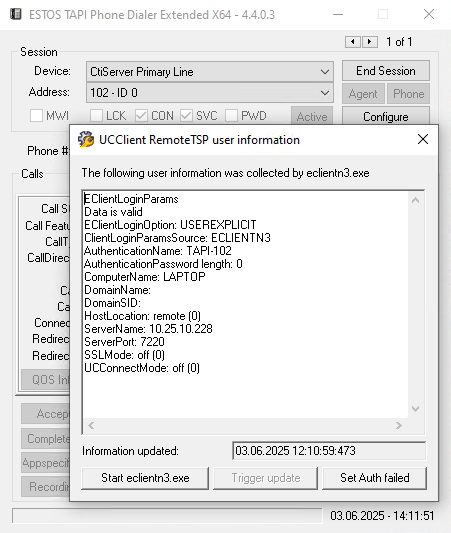Um die im Shared Memory des Remote TAPI-Treibers gespeicherten Benutzerdaten in einer Microsoft Windows Benutzersitzung anzeigen zu lassen, steht das Abfragewerkzeug eclientntester.exe zur Verfügung, der Titel des Fensters zeigt UCClient RemoteTSP user information.