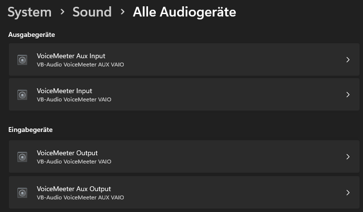 Beispiel Screenshot: VoiceMeeter Banana virtuelle Aufnahme- und Wiedergabegeräte unter System - Sound - Alle Audiogeräte