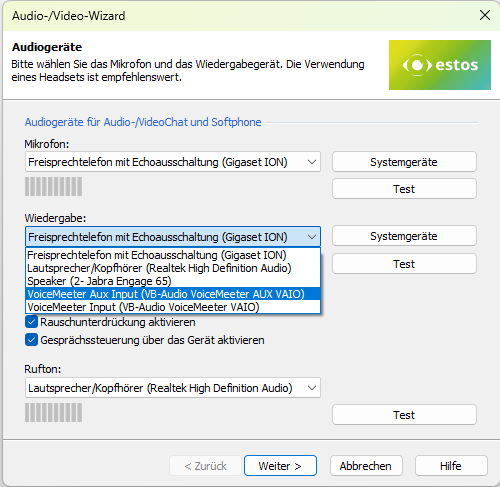 In estos ProCall Desktop for Windows können diese virtuellen Wiedergabegeräte im Audio-/Video-Wizard ausgewählt werden: