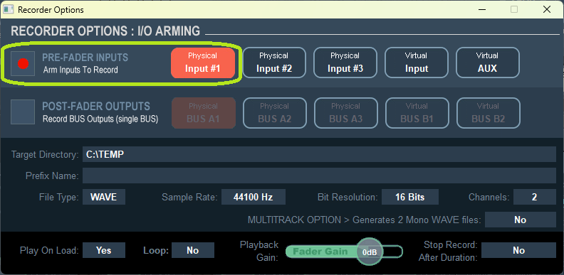 Beispiel Screenshot: VoiceMeeter Banana Recorder Options - Pre-fader inputs