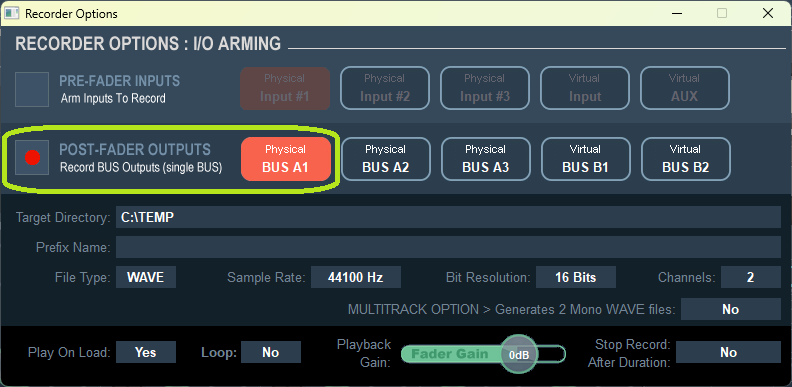 POST-FADER OUTPUTS steht für die Aufzeichnung am Ende des Busses, auf den dann bereits die Verstärkungseinstellungen für den Input (Fader Gain) ausgeübt wurden: