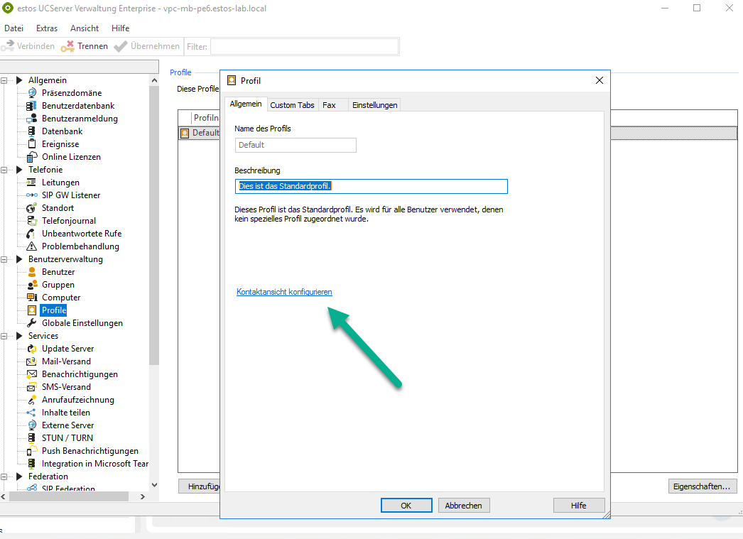 Beispiel Screenshot: estos UCServer Verwaltung - Benutzerverwaltung - Profile - Kontaktansicht konfigurieren