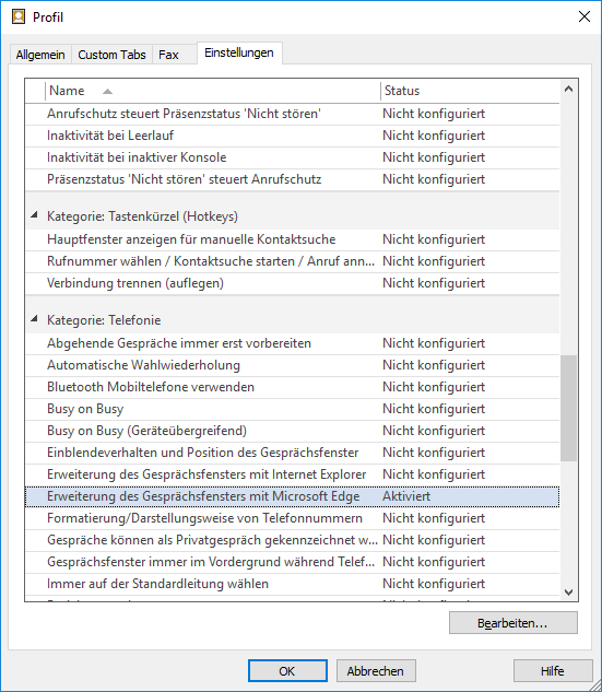 Profil → Einstellungen → Kategorie: Telefonie → Erweiterung des Gesprächsfensters mit Microsoft Edge → Aktiviert