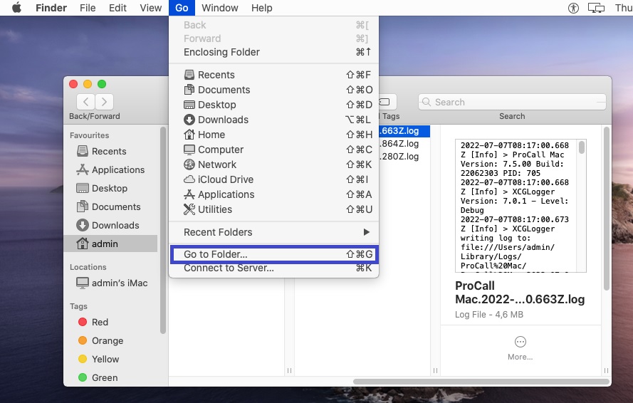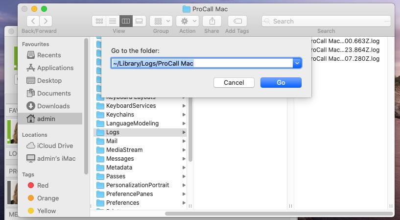Beispiel Screenhot ProCall Mac - admin - Logs - Got to the folder
