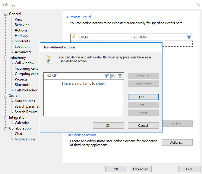 Über die "Einstellungen → Aktionen → Benutzerdefinierte Aktionen" im ProCall Client für Windows können Sie das Hauptmenü, Kontextmenüs oder Gesprächsfenster anpassen.