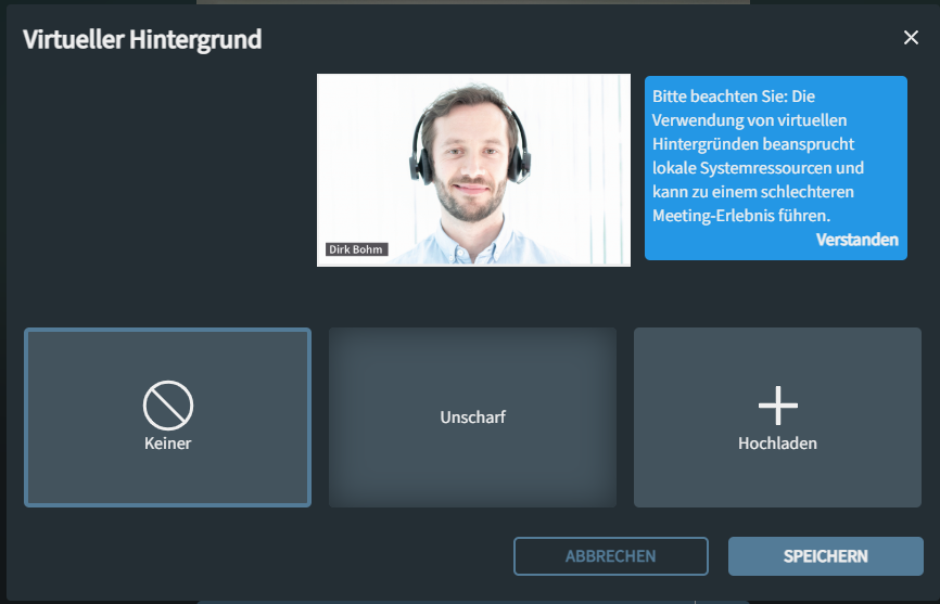 Die Verwendung von virtuellen Hintergründen steht nur auf Desktop PCs zur Verfügung. Der Unschärfe-Effekt (Blur) kann auch auf mobilen Android Endgeräten aktiviert werden.