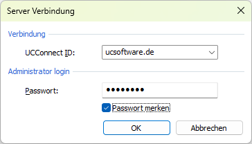 Die Einstellungen zu UCConnect ID und Passwort können lokal gespeichert werden, wenn der Haken  "Passwort merken" gesetzt wurde. So können Sie verschiedene Kunden über den ProCall NEX Server Administrator verwalten. Über das Dropdown Menü bei UCConnect ID finden Sie alle Kunden, mit denen Sie sich schon verbunden haben.