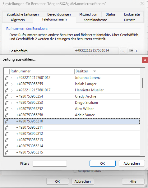 Für jeden aktivierten Benutzer wird in der erstellten Leitungsgruppe eine "Leitung" angelegt, unabhängig davon, ob dem Benutzer ein Softphone und/oder ein Endgerät zugewiesen wurde.