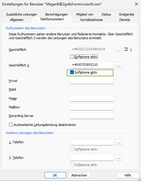 Beispiel Screenshot - Einstellungen für Benutzer - Rufnummern des Benutzers - Haken gesetzt bei "Softphone aktiv"
