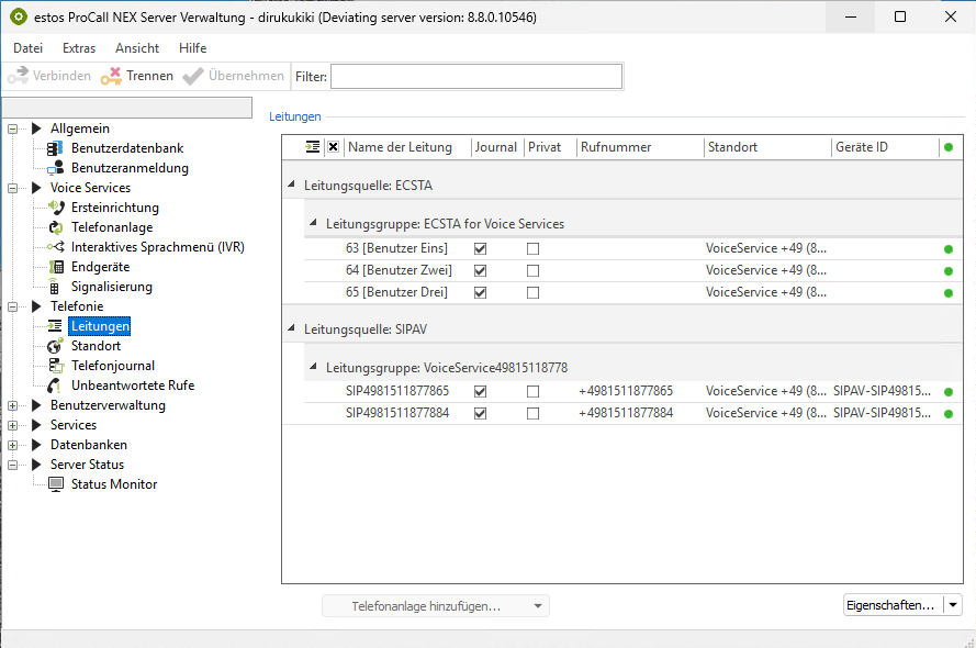 Beispiel Screenshot - ProCall NEX Server Verwaltung - Telefonie - Leitungen
