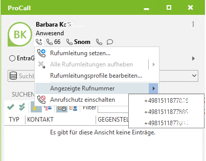 Beispiel Screenshot - ProCall Client Leitungen - Angezeigte Rufnummer
