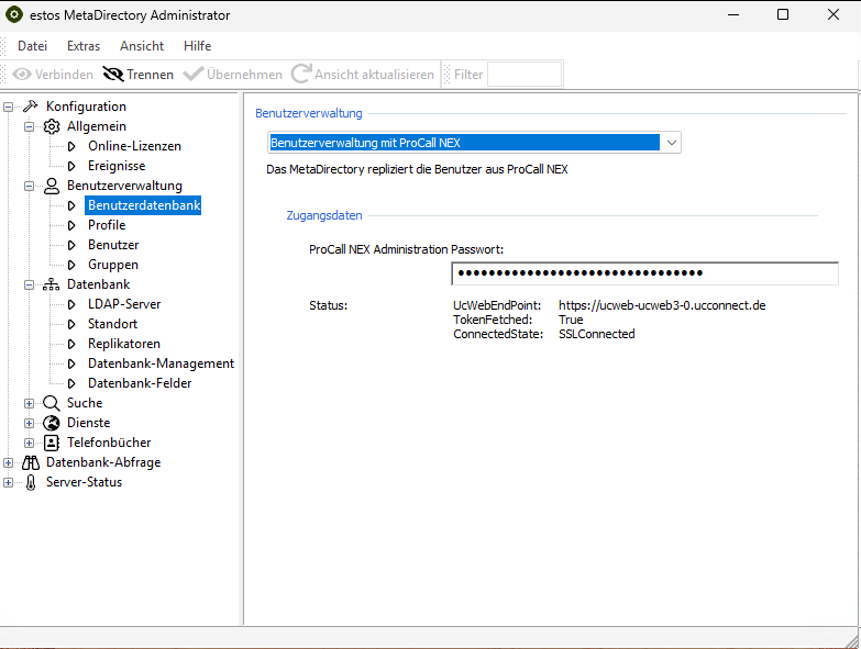 Beispiel Screenshot MetaDirectory Administration - Konfiguration - Benutzerverwaltung - Benutzerdatenbank - Replikation mit ProCall NEX - Zugangsdaten