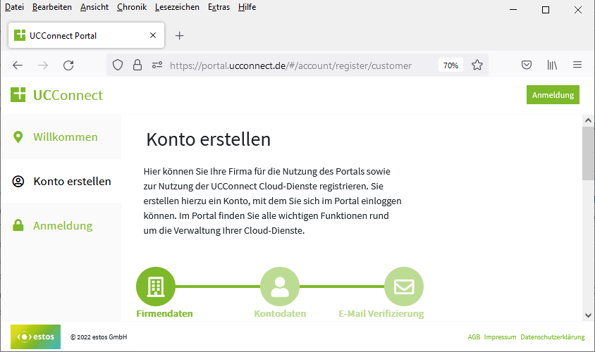 Als Endanwenderunternehmen können Sie unter https://portal.ucconnect.de/ ein neues Konto anlegen.